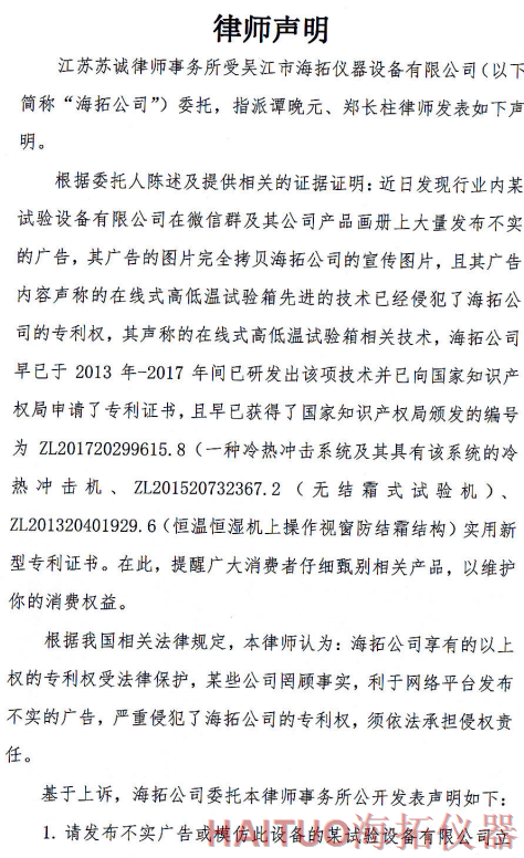 海拓儀器律師聲明:反對侵權(quán)行為 維護(hù)公司和消費(fèi)者權(quán)益摘要:國內(nèi)試驗(yàn)設(shè)備領(lǐng)先者吳江市海拓儀器設(shè)備有限公司委托律師事務(wù)所發(fā)布了律師聲明,該聲明指出,當(dāng)前市面上出現(xiàn)了產(chǎn)品專利侵犯海拓儀器權(quán)益,海拓儀器將以法律手段維護(hù)自身利益。該律師聲明要求某試驗(yàn)設(shè)備有限公司立即停止侵權(quán)行為,扯下其在網(wǎng)絡(luò)平臺(tái)的相關(guān)廣告和宣傳畫冊并同時(shí)停止生產(chǎn)同款設(shè)備。如果該設(shè)備公司不聽勸解,海拓儀器將向人民法院依法起訴該公司侵權(quán)行為,以維護(hù)自身合法權(quán)益和維護(hù)客戶消費(fèi)權(quán)益,并建議廣大消費(fèi)者仔細(xì)甄別相關(guān)產(chǎn)品。? ? ? ?近日,吳江市海拓儀器設(shè)備有限公司委托律師事務(wù)所發(fā)布了律師聲明,該聲明指出,當(dāng)前市面上出現(xiàn)了產(chǎn)品專利侵犯海拓儀器權(quán)益,海拓儀器將以法律手段維護(hù)自身利益。??事件源起于海拓儀器發(fā)現(xiàn)市面上有同類設(shè)備公司通過完全拷貝海拓儀器產(chǎn)品宣傳圖片,在微信群及該公司產(chǎn)品畫冊上大量發(fā)布不實(shí)廣告。??聲明指出,該廣告聲稱的在線式高低溫試驗(yàn)箱的技術(shù)侵犯了海拓儀器的專利權(quán),該產(chǎn)品專利由海拓儀器 -